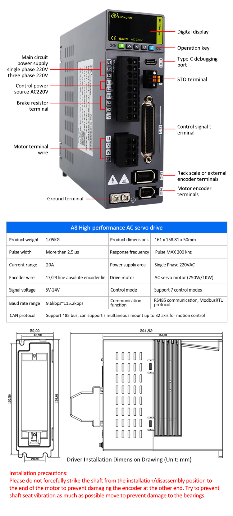 पल्स/RS485 750W/1000W/1001W 2500/3000RPM A8 उच्च सटीकता STO ABZ AC सर्वो मोटर ड्राइभर किट