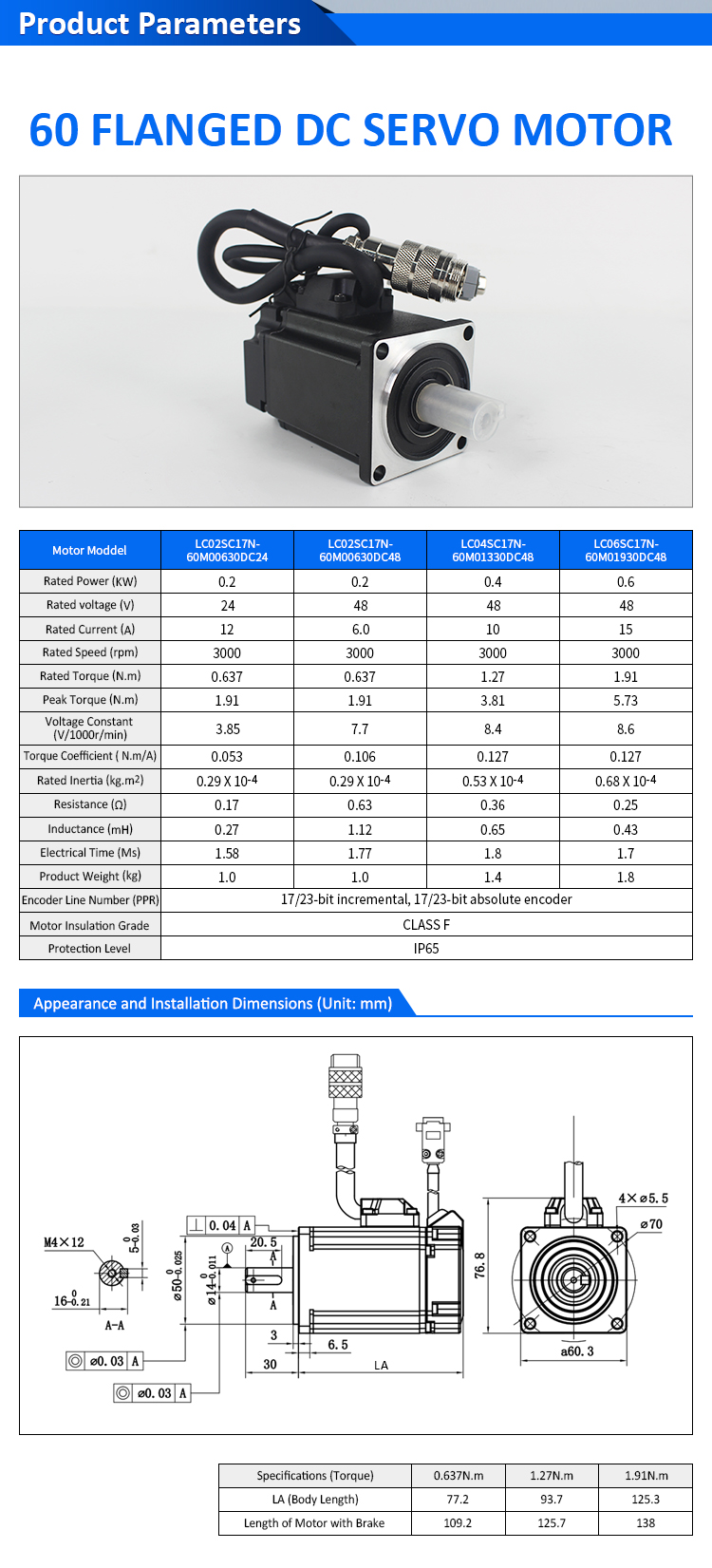 पल्स/RS485/CANopen/EtherCAT 60 FLANGED 400W कम भोल्टेज DC सर्वो मोटर ड्राइभर किट